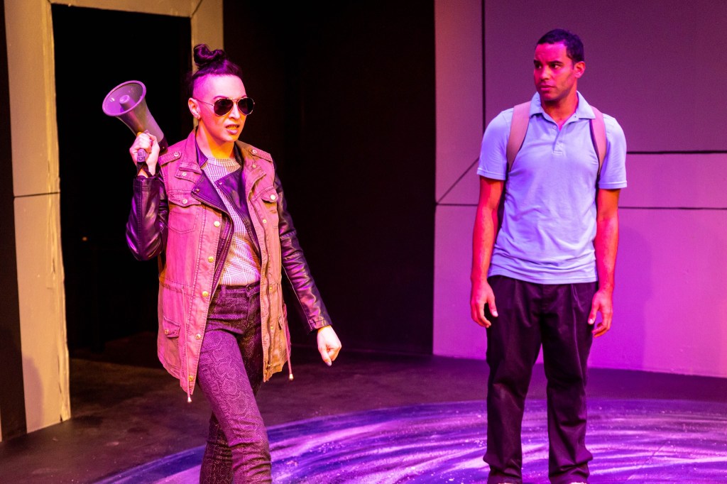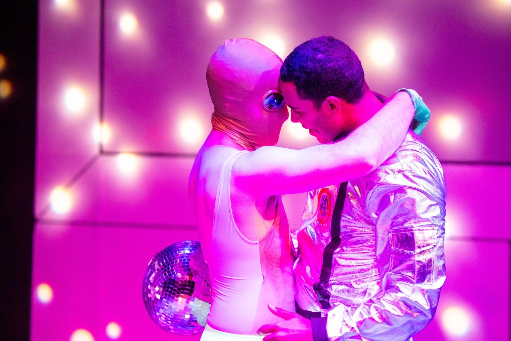 This ridiculousness has to grounded in something, and there are basically two fulcrums holding the action firm. The first is the always solid Shannon Grounds, who here, much like many of the performers, wears many faces, and what she brings to each is an assuredness that makes even the most fanciful of them believable. One of Grounds’ greatest talents is her ability to bring humanity to any role, and here she delivers even on strange ground, whether she’s playing the exuberant “Principal of NASA”; a 40-something clubbing AI; or, her best role, a world-weary doctor. Some of the truest emotion in the piece comes from the comforting conversations between our lead Skip and the jaded Dr. Darla, which create a sense of comfort in a sea of lunacy that’s quite refreshing, and it’s to Grounds’ credit that these work while never feeling out of place amongst all the nonsense.